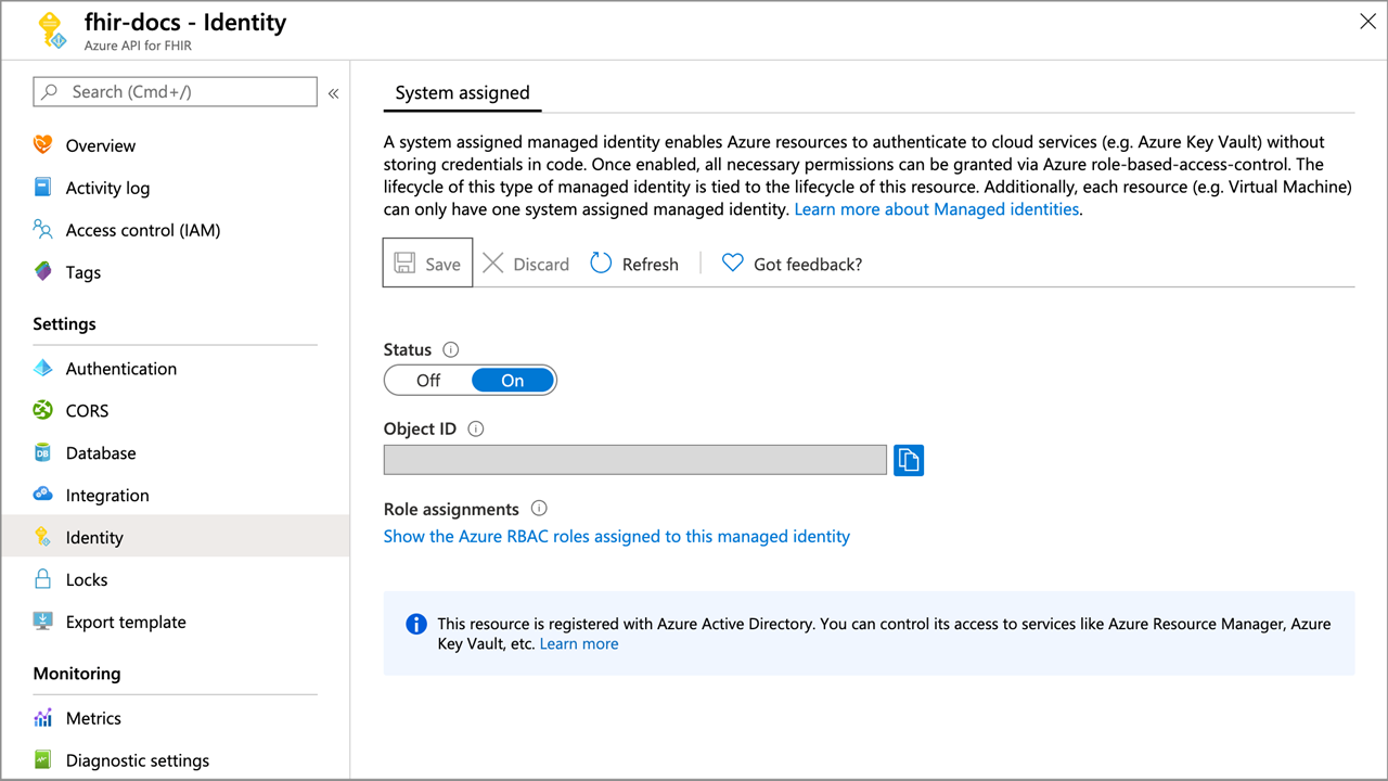 Browse to your instance of Azure API for FHIR service in the Azure portal, and then select the Identity blade. Change the status to On to enable managed identity in Azure API for FHIR.