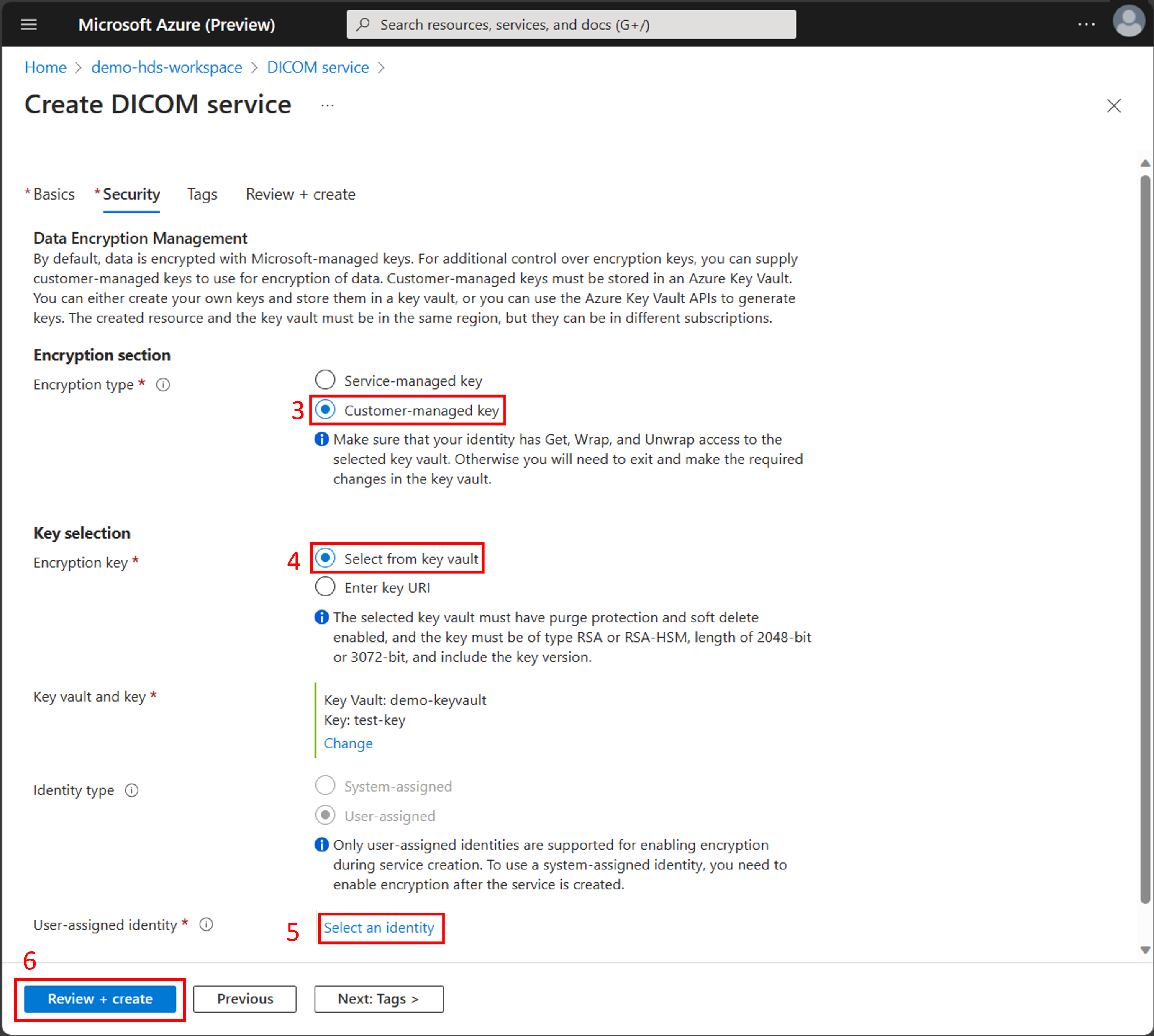 If you use a user-assigned managed identity with the DICOM service, you can configure customer-managed keys at the same time you create the DICOM service.