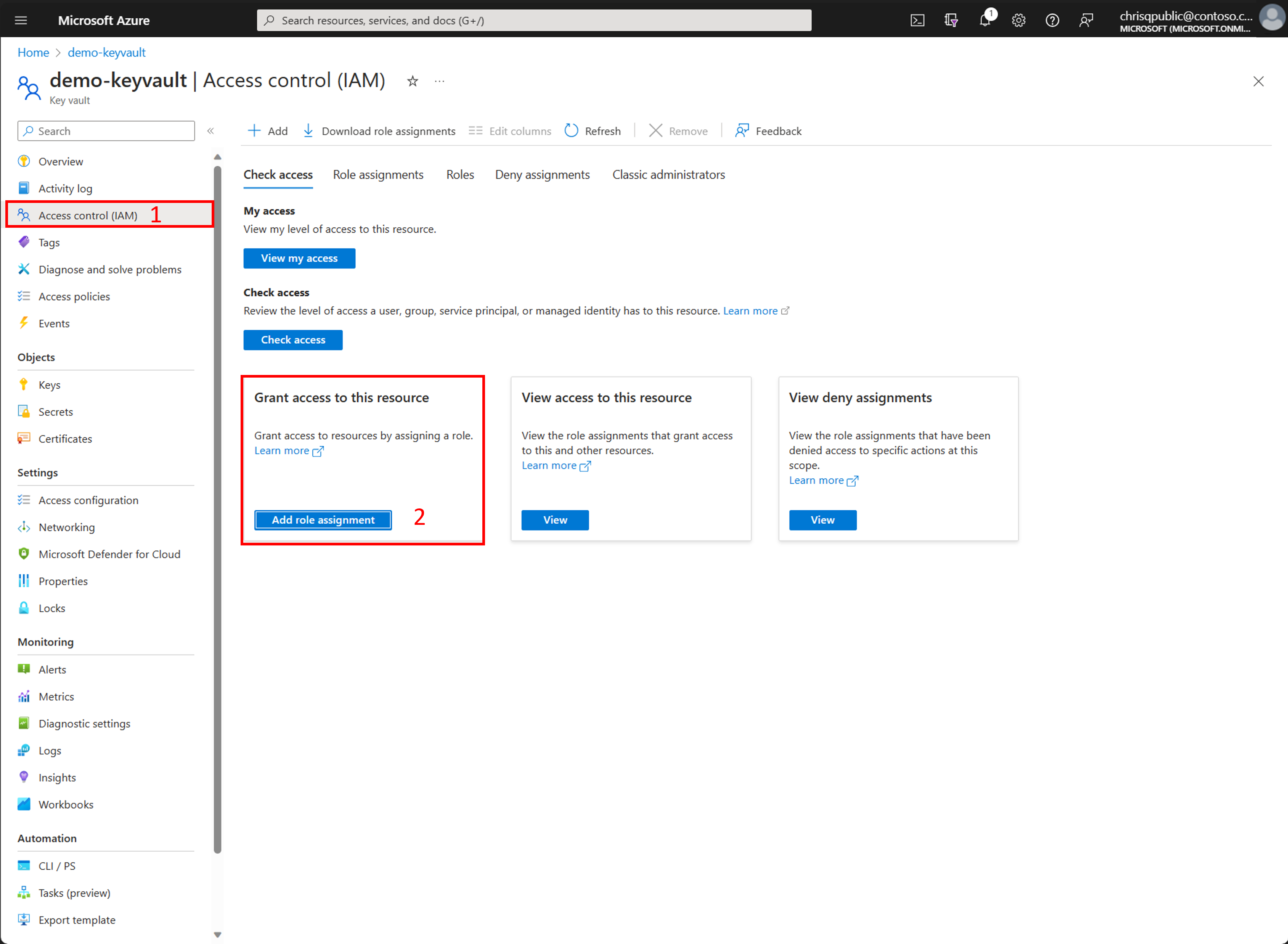In the Azure portal, go to the key vault and then select Access control (IAM) from the left pane.