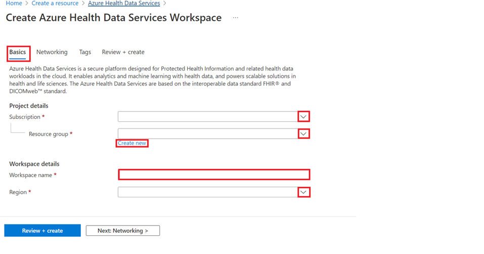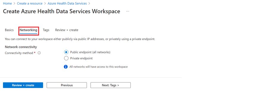 Select Next: Networking >. Connect a workspace publicly with the default Public endpoint (all networks) option selected. You can also connect a workspace using a private endpoint by selecting the Private endpoint option. For more information about accessing Azure Health Data Services over a private endpoint, see Configure Private Link for Azure Health Data Services.