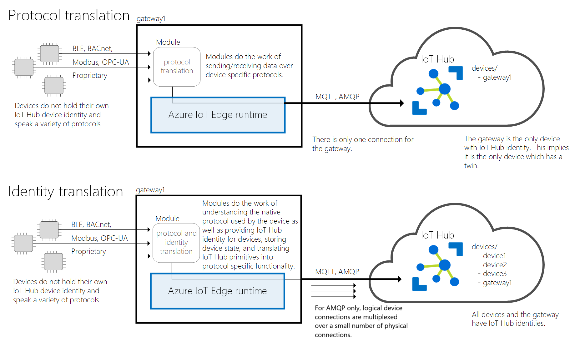 The IoT Edge runtime doesn't include protocol or identity translation capabilities. These patterns require custom or non-Microsoft modules that are often specific to the hardware and protocol used. Azure Marketplace contains several protocol translation modules to choose from. For a sample that uses the identity translation pattern, see Azure IoT Edge LoRaWAN Starter Kit.