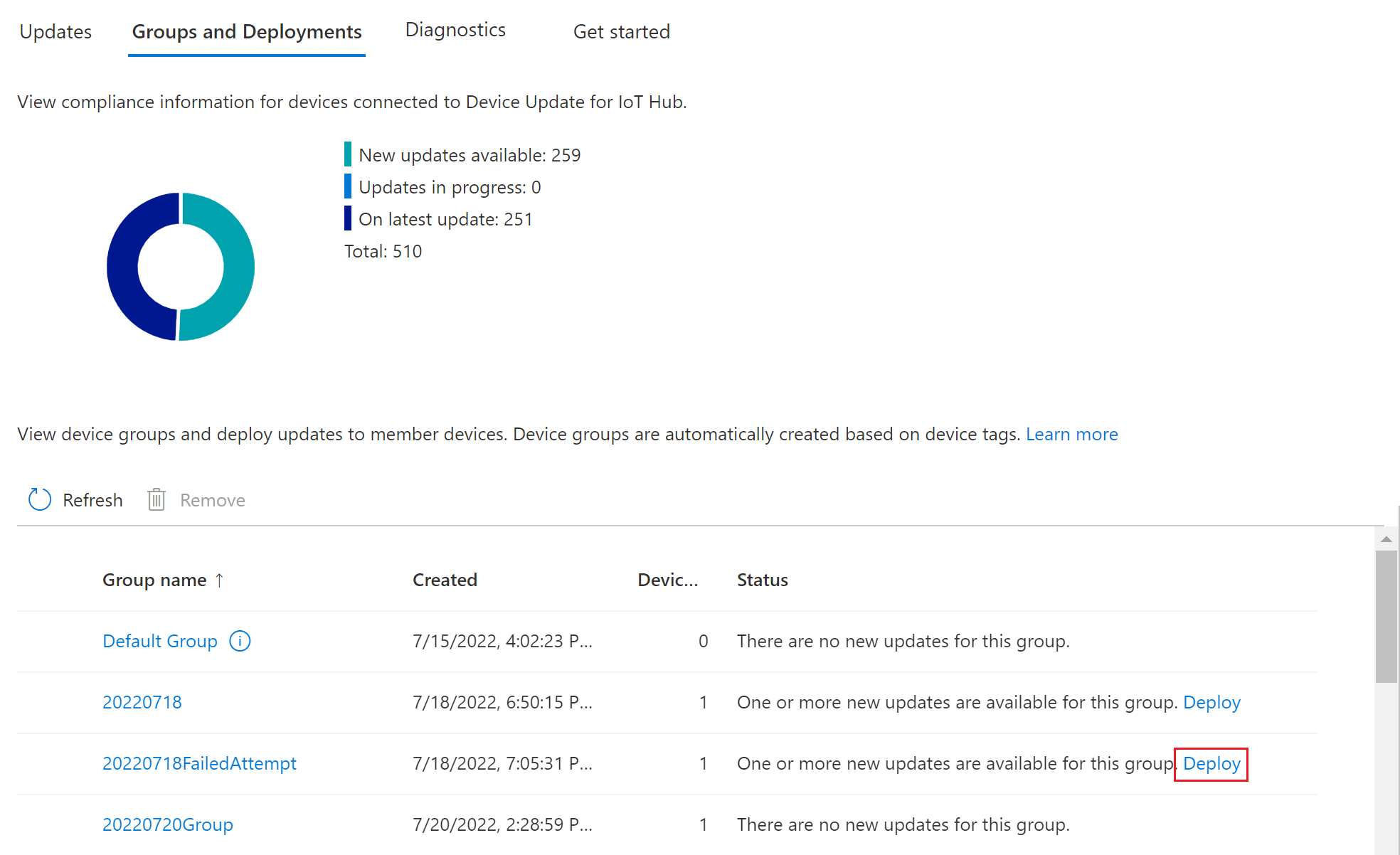 You should see the device group that contains the device you set up in this tutorial, along with the available updates for the devices in the group. You might need to refresh the page. To deploy the best available update to a group from this view, select Deploy next to the group.