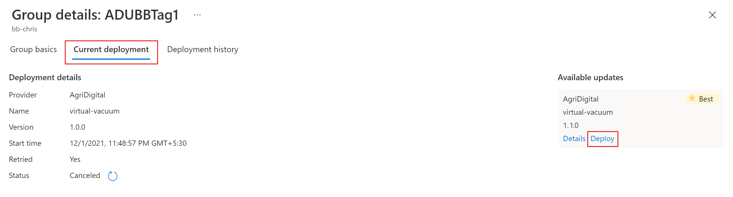 On the Group details page, select the Current deployment tab, and then select Deploy next to the desired update in the Available updates section. The best available update for the group is denoted with a Best highlight.
