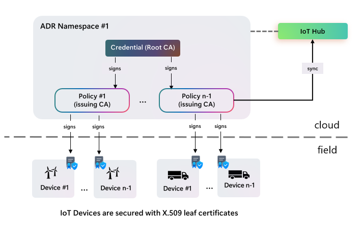 IoT Hubs that are linked to an ADR namespace can take advantage of certificate management capabilities. You can sync your CA certificates from ADR namespace to all of your IoT Hubs, so that each IoT Hub can authenticate any IoT device that attempts to connect with issued certificate chain.
