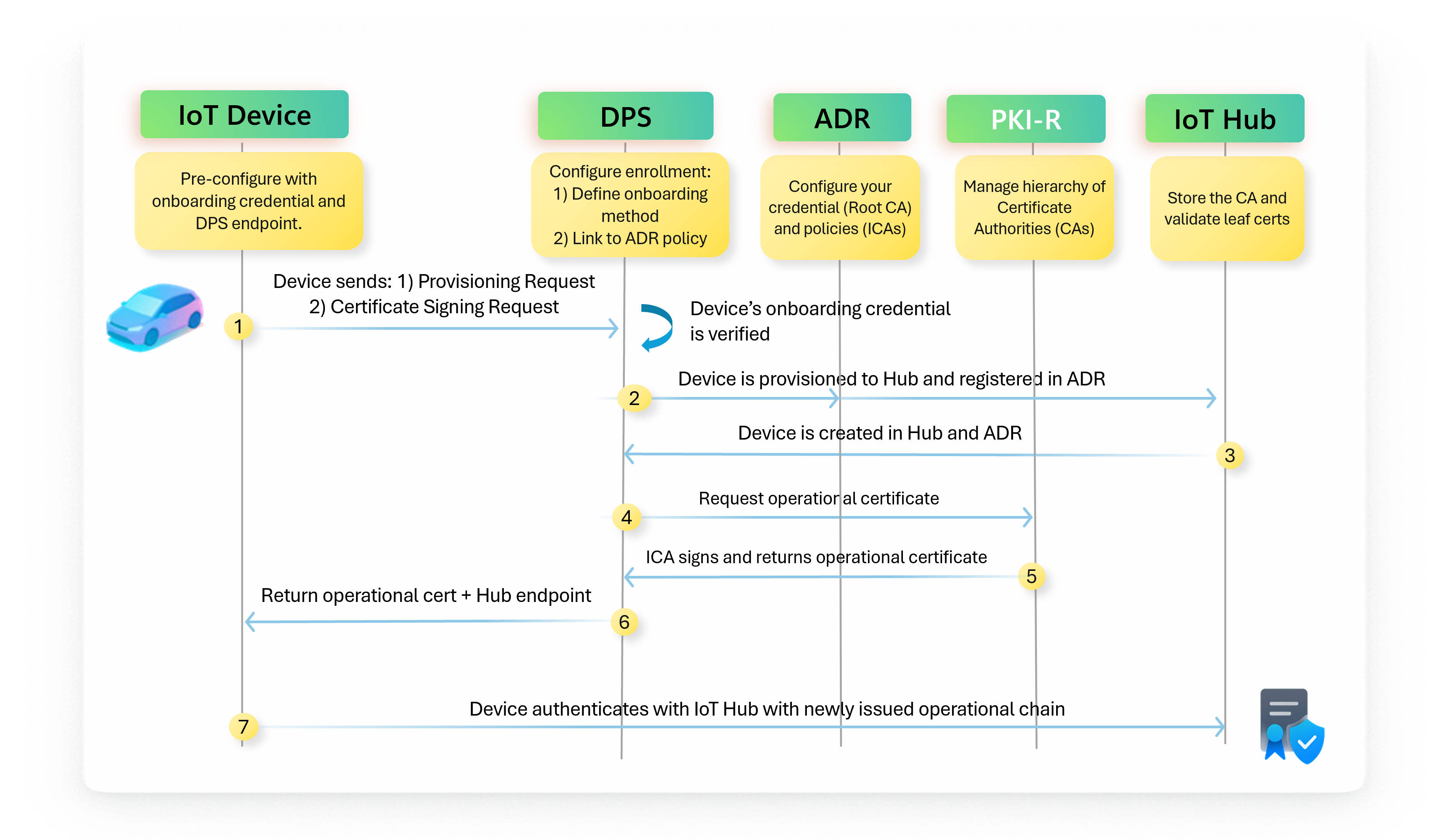 - DPS sends the operational certificate and IoT Hub connection details back to the device.