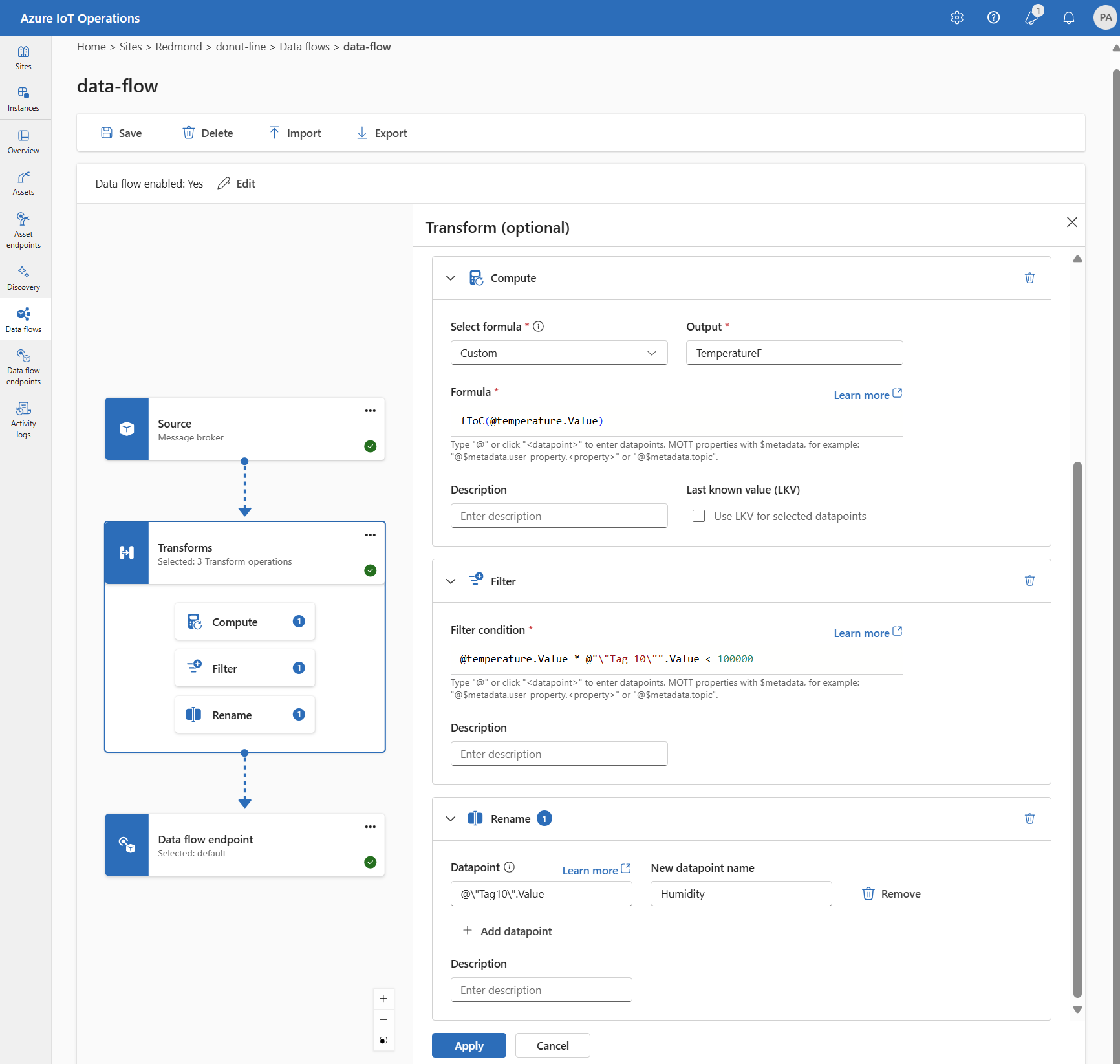 A data flow is the path that data takes from the source to the destination with optional transformations. You can configure the data flow by creating a Data flow custom resource or using the operations experience web UI. A data flow is made up of three parts: the source, the transformation, and the destination.