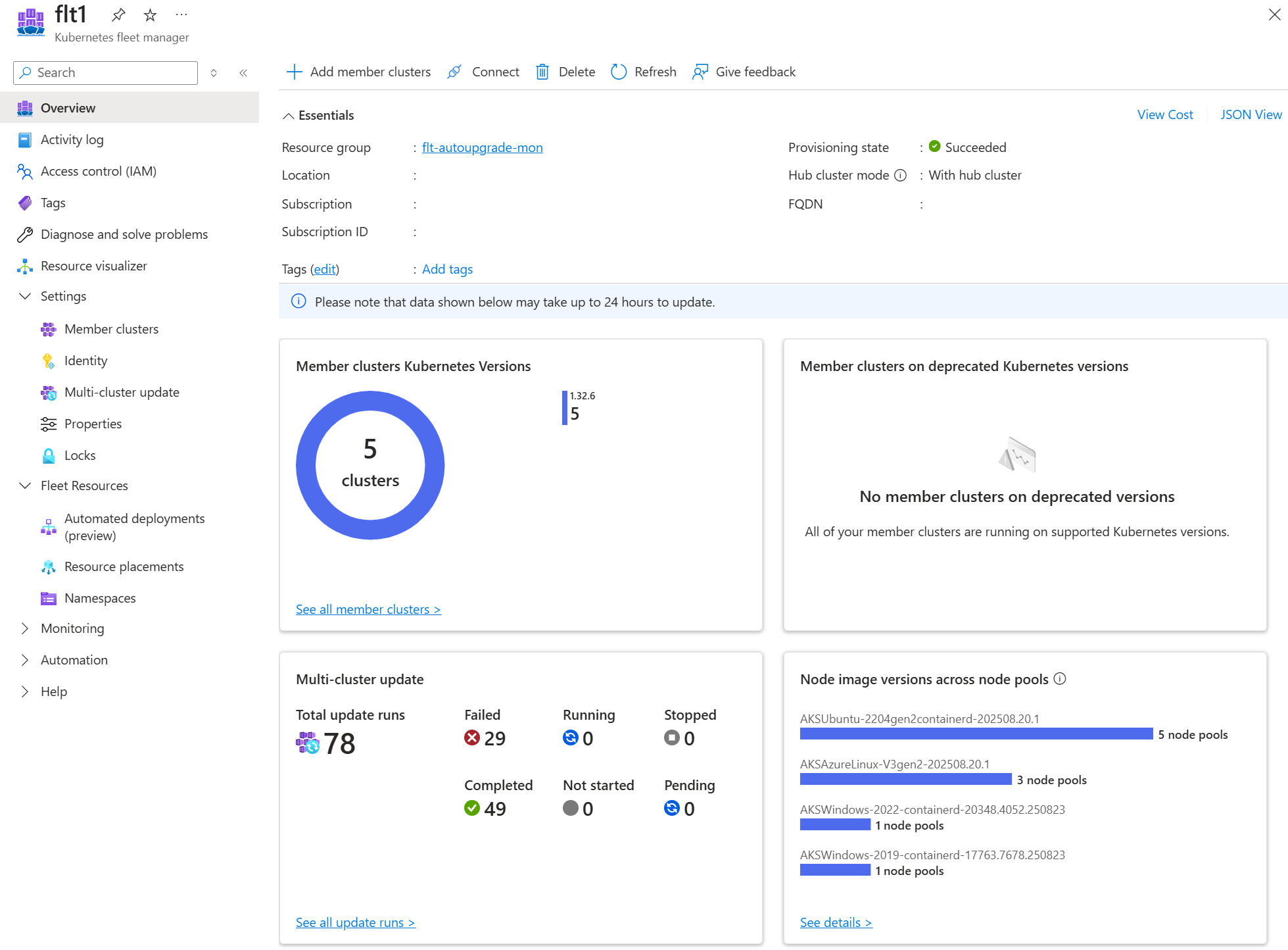 Azure Kubernetes Fleet Manager enables at-scale management of multiple supported Kubernetes clusters. Fleet Manager provides platform administrators with access to automated safe multi-cluster updates, intelligent Kubernetes resource placement, and a centralized location to access monitoring data for their clusters.
