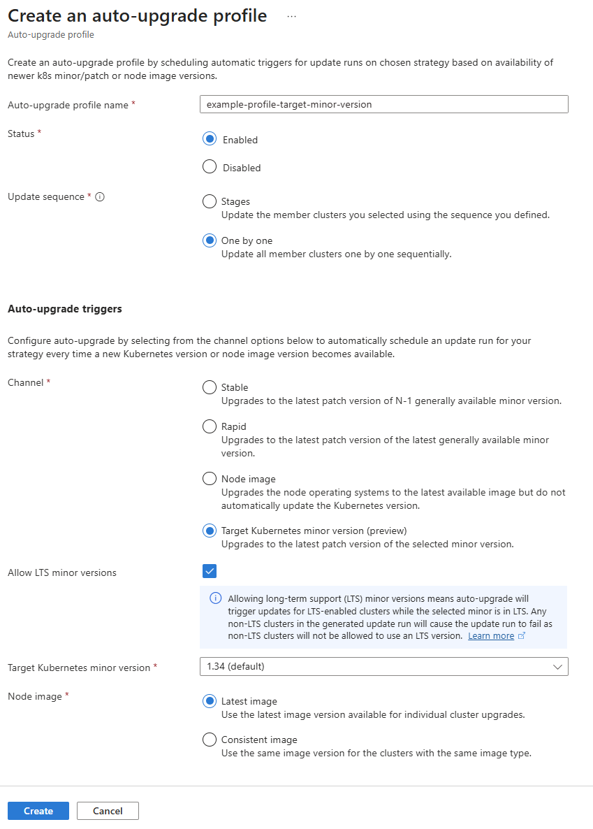 --long-term-support, is only available when using the Target Kubernetes minor version channel. For other channels, you need to set this flag to False. - You can only select LTS Kubernetes versions (N-2) for an auto-upgrade profile with the