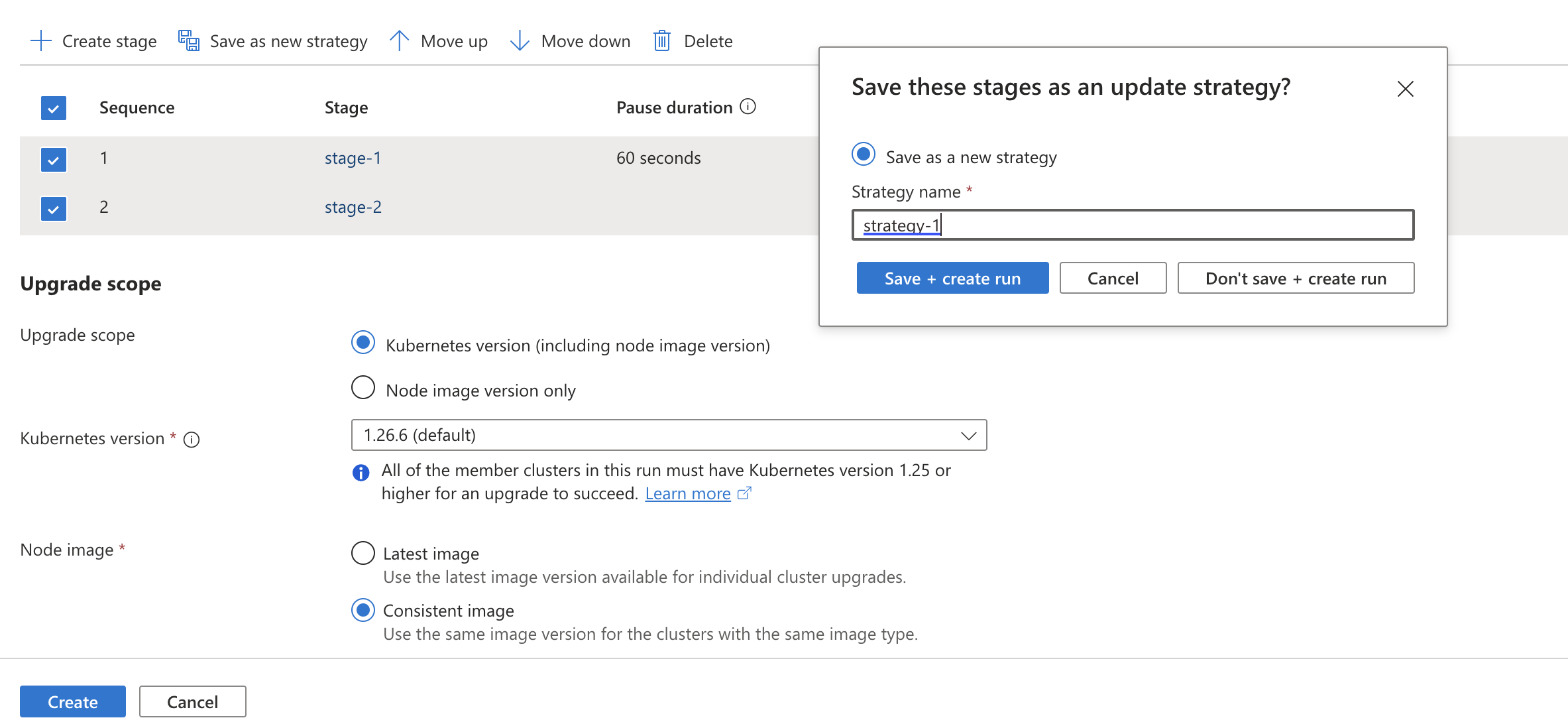 You can define an update run using update stages to sequentially order the application of updates to different update groups. For example, a first update stage might update test environment member clusters, and a second update stage would then update production environment member clusters. You can also specify what approvals are required before or after each stage, and a wait time between the update stages. You can store this sequence as a template in the form of an update strategy.