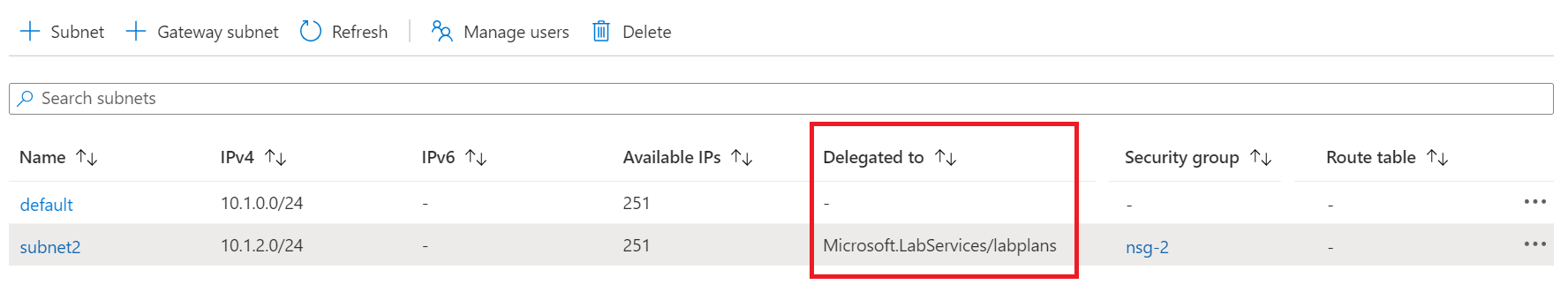 Verify that Microsoft.LabServices/labplans appears in the Delegated to column for your subnet.