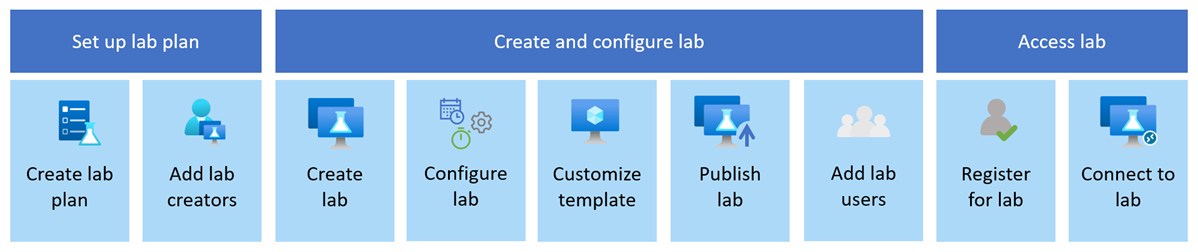 The following diagram shows the different steps involved in creating and accessing labs with Azure Lab Services.