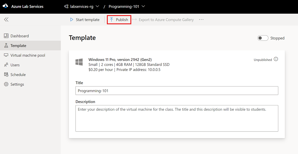The lab template serves as the basis for the lab VMs. To make sure that lab users have the right configuration and software components, you can customize the lab template.