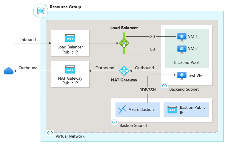 In this section, you create a NAT gateway for outbound internet access for resources in the virtual network. For other options for outbound rules, check out Network Address Translation (SNAT) for outbound connections