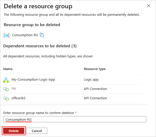 Find and select your logic app's resource group. On the Overview pane, select Delete resource group.