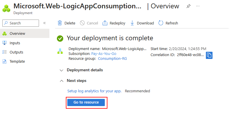 After Azure successfully deploys your logic app resource, select Go to resource. Or, find and select your logic app resource by using the Azure search box.