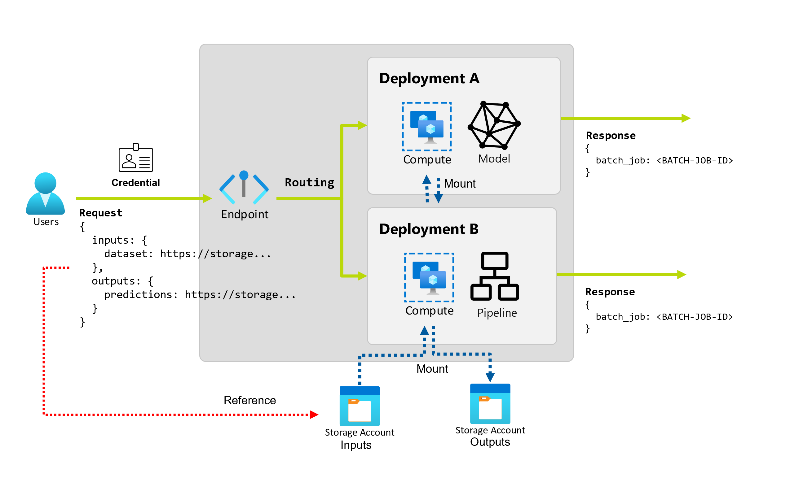A deployment is a set of resources and computes required to implement the functionality that the endpoint provides. An endpoint can host multiple deployments, each with its own configuration, decoupling the endpoint interface from the deployment implementation details. When a batch endpoint is invoked, it automatically routes the client to its default deployment. This default deployment can be configured and changed at any time.
