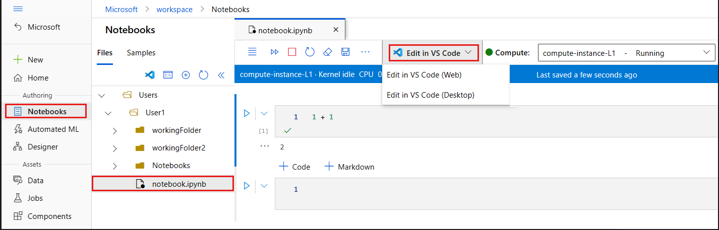 - You can open VS Code from your workspace either in the browser by using VS Code for the Web or use VS Code desktop.