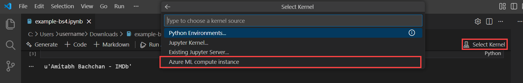 Use a Remote Jupyter Notebook server. This option enables you to set a compute instance as a remote Jupyter Notebook server. This option is available only in VS Code desktop.