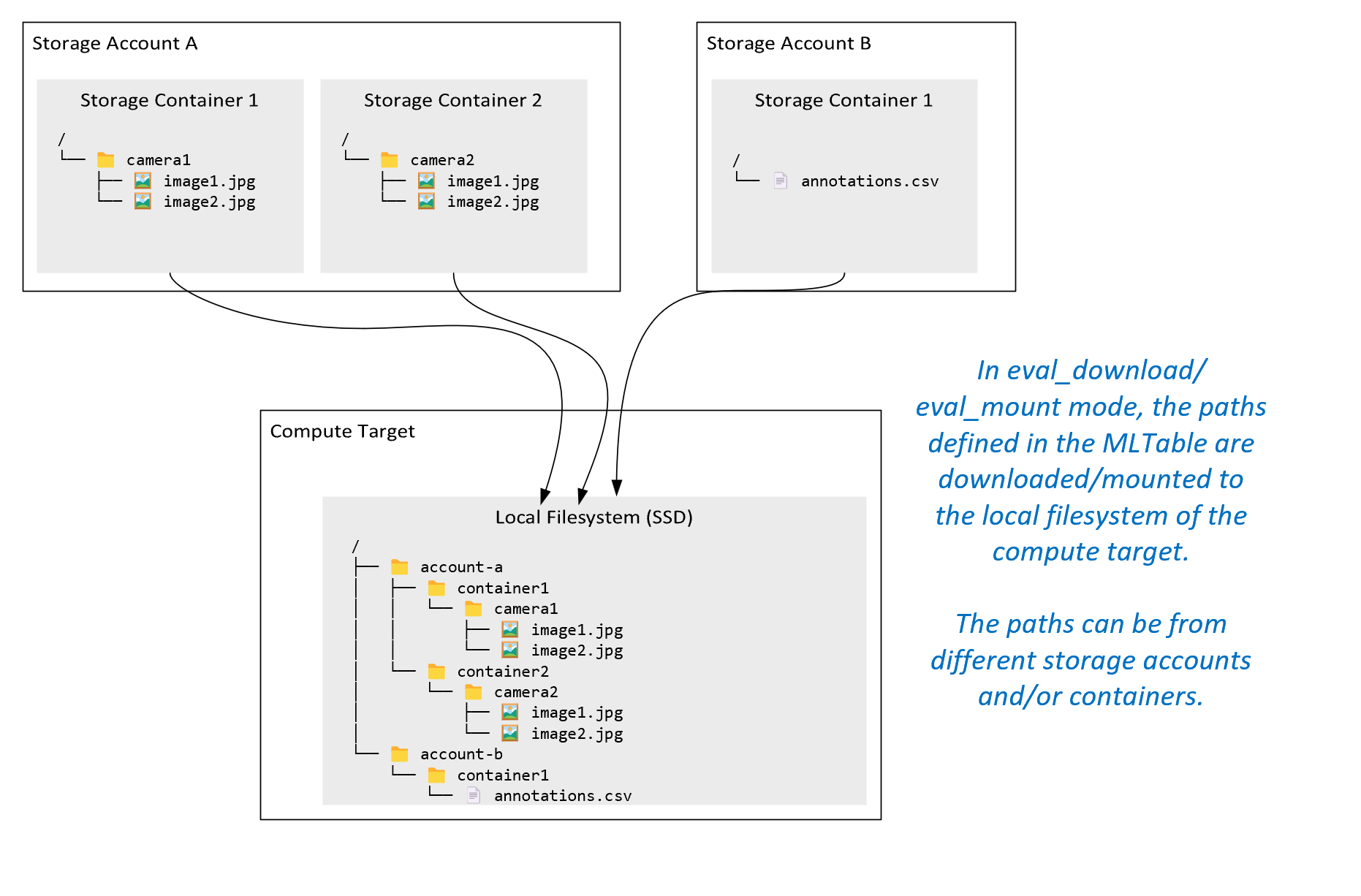 If you can't increase the maximum egress capacity or request rate limit, you should consider replicating the data across multiple storage accounts. Copy the data to multiple accounts with Azure Data Factory, Azure Storage Explorer, or azcopy, and mount all the accounts in your training job. Only the data accessed on a mount is downloaded. Therefore, your training code can read the RANK from the environment variable, to pick which of the multiple inputs mounts from which to read. Your job definition passes in a list of storage accounts: