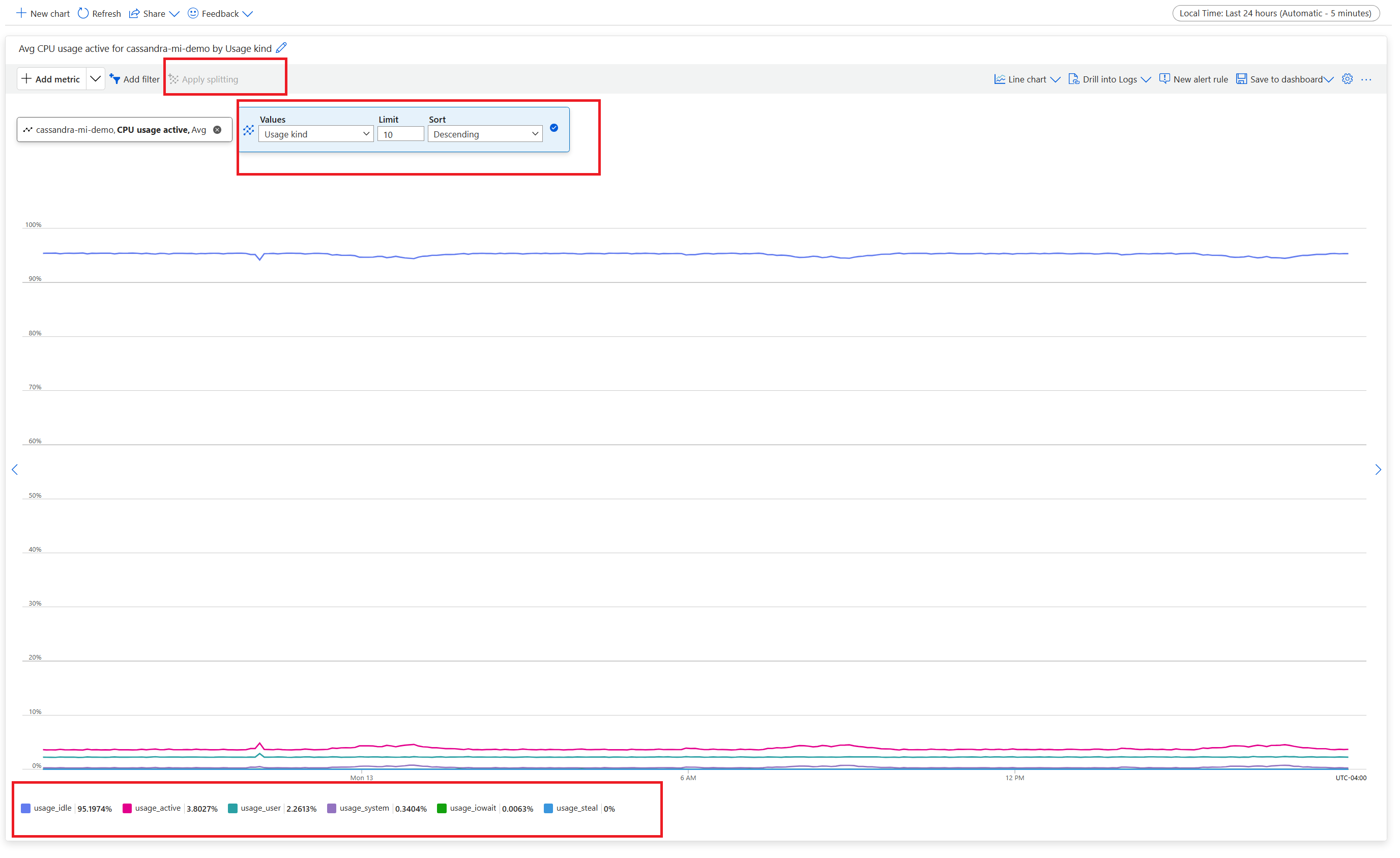 For a realistic CPU view, add a filter and use Usage kind=usage_idle to split the property. If this value is lower than 20%, apply splitting to obtain usage by all usage kinds.