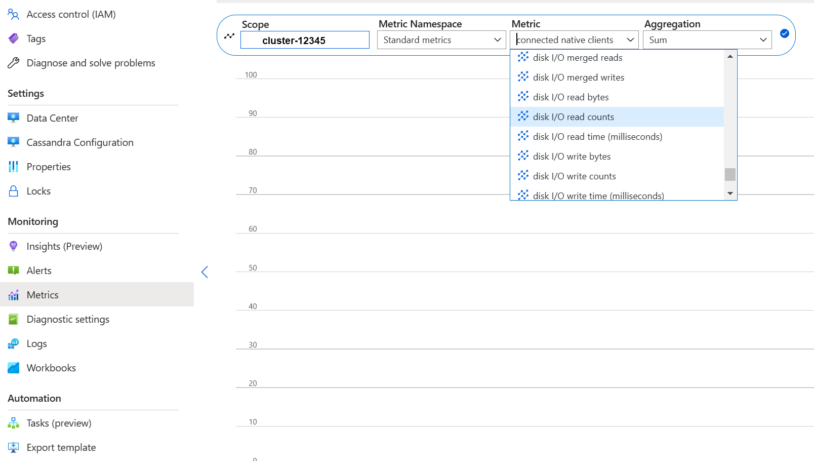 Like every database system, Cassandra works best if the CPU utilization is around 50% and never gets above 80%. To view CPU metrics, from the Azure portal, under the Monitoring section, open the Metrics tab.