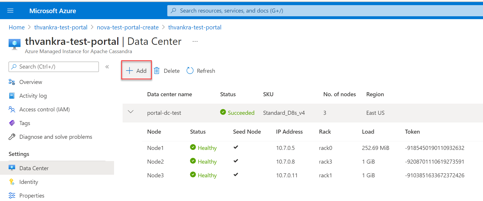 5. If you add a datacenter to a cluster that already has data, run rebuild to replicate the historical data. In the Azure CLI, use the following command and run nodetool rebuild on each node of the new datacenter. This action replaces <new dc ip address> with the IP address of the node and replaces <olddc> with the name of your existing datacenter: