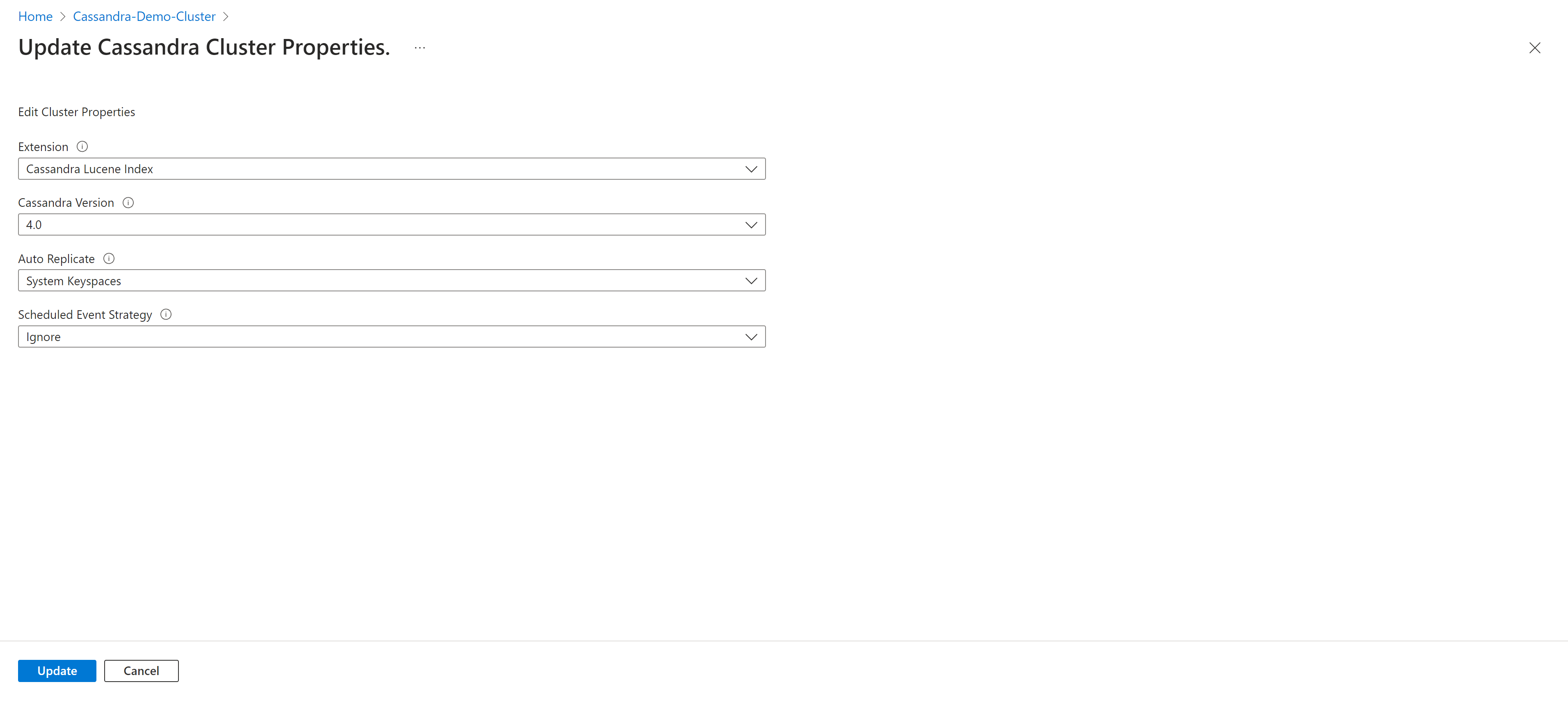 You can use the Azure portal or CLI commands to update Cassandra YAML configuration on a datacenter. To update settings in the portal:
