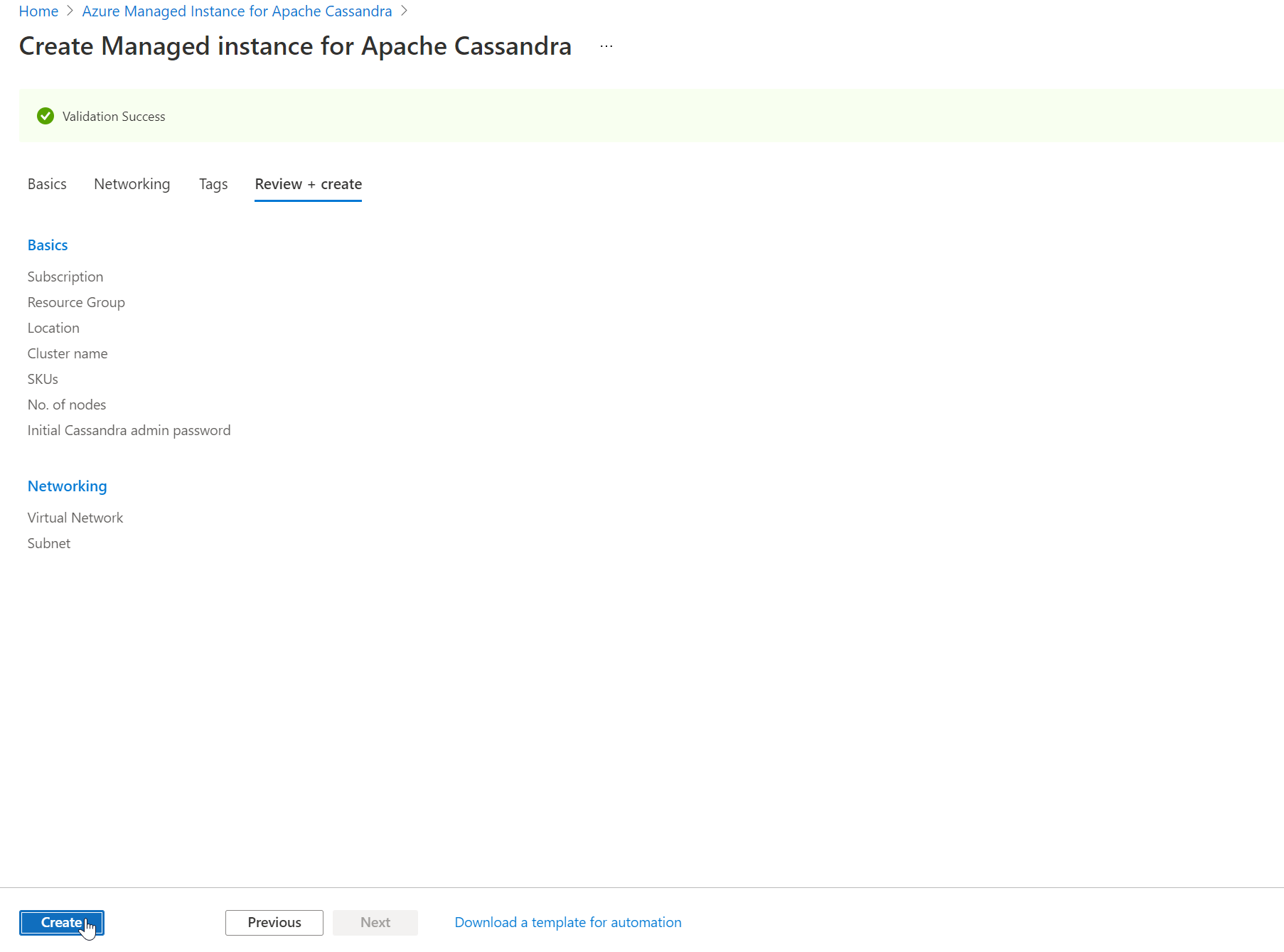 • Assign roles: Virtual networks require special permissions to allow managed Cassandra clusters to be deployed. Keep this box selected if you create a new virtual network or use an existing virtual network without permissions applied. If you use a virtual network where you previously deployed Azure SQL Managed Instance Cassandra clusters, clear this option.