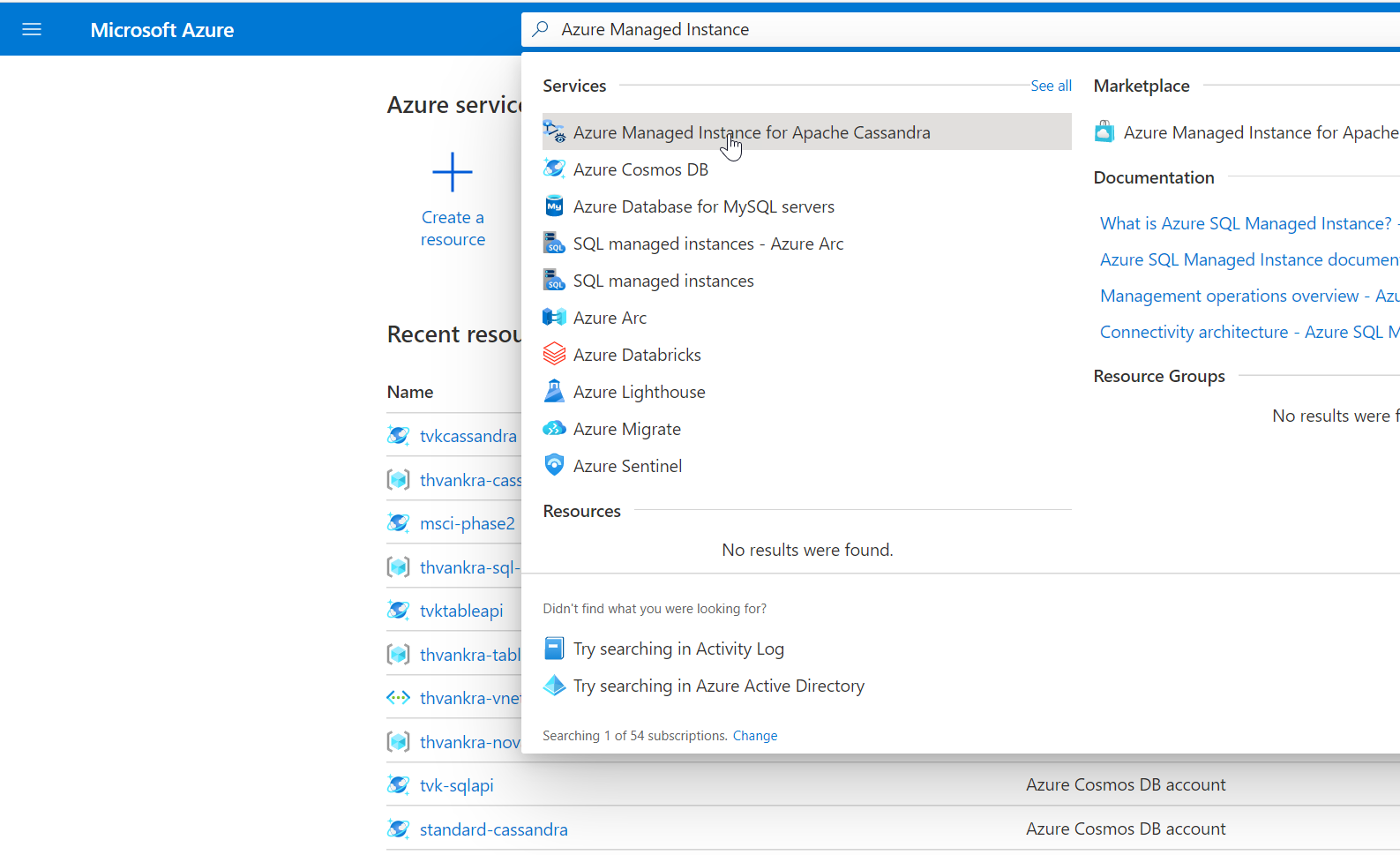 Screenshot that shows searching for Azure SQL Managed Instance for Apache Cassandra.