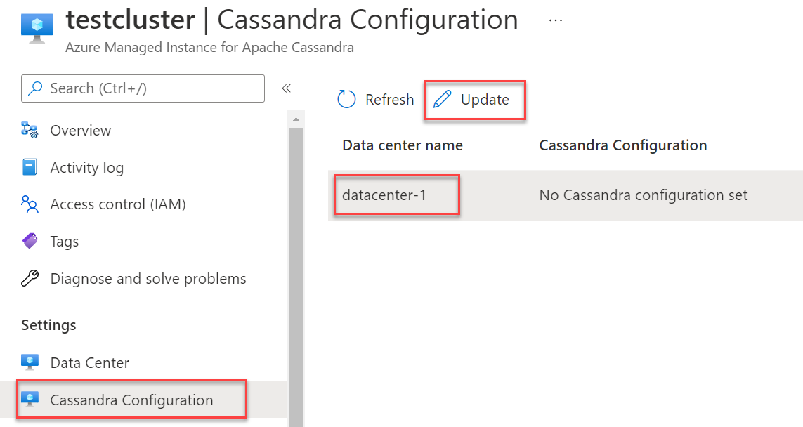 1. Under Settings, select Cassandra Configuration. Highlight the datacenter whose configuration you want to change, and then select Update.