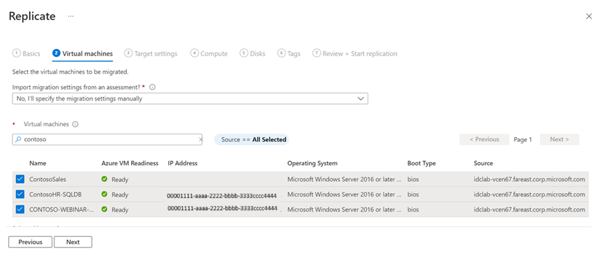 In Virtual machines, in Import migration settings from an assessment?, leave the default setting No, I'll specify the migration settings manually.