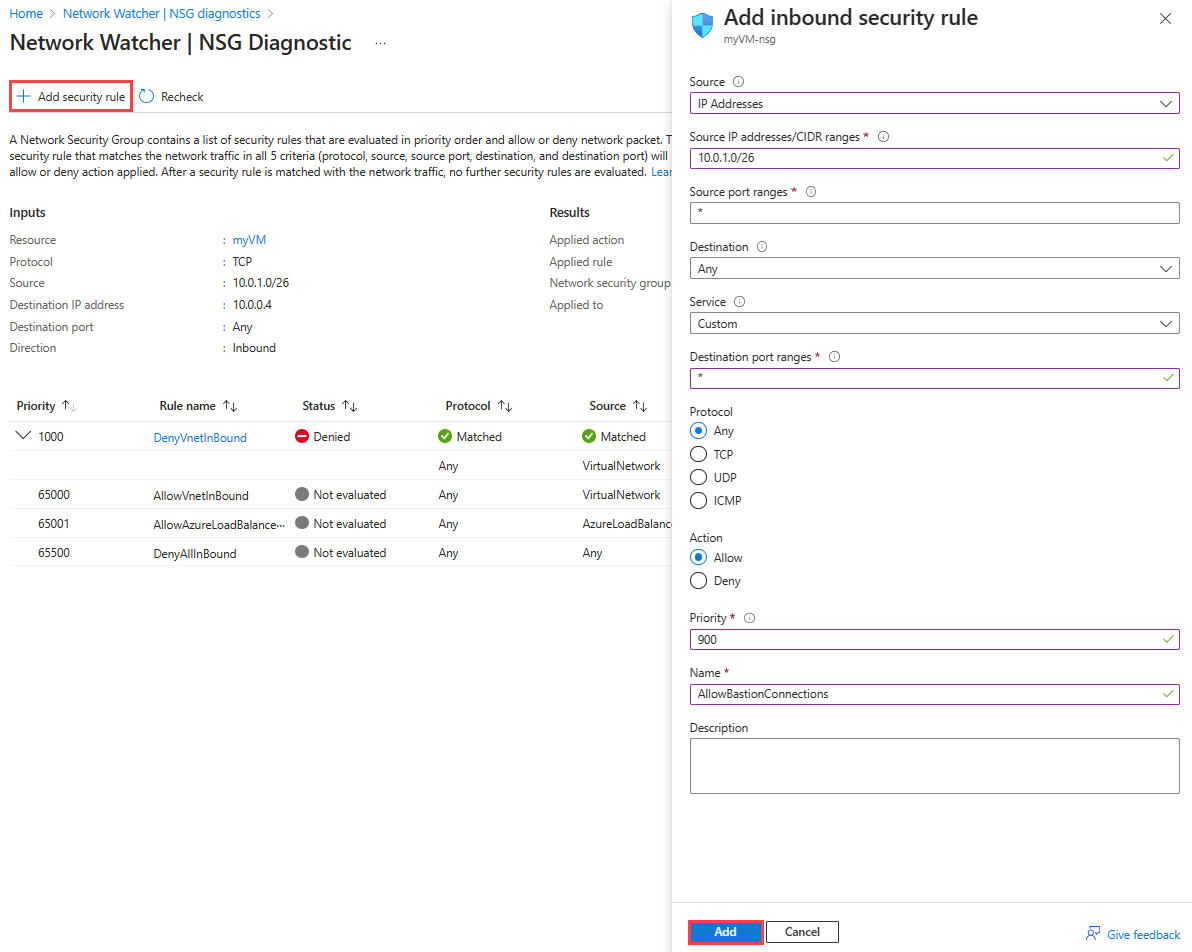 To add the security rule from within Network Watcher, select + Add security rule, and then enter or select the following values:
