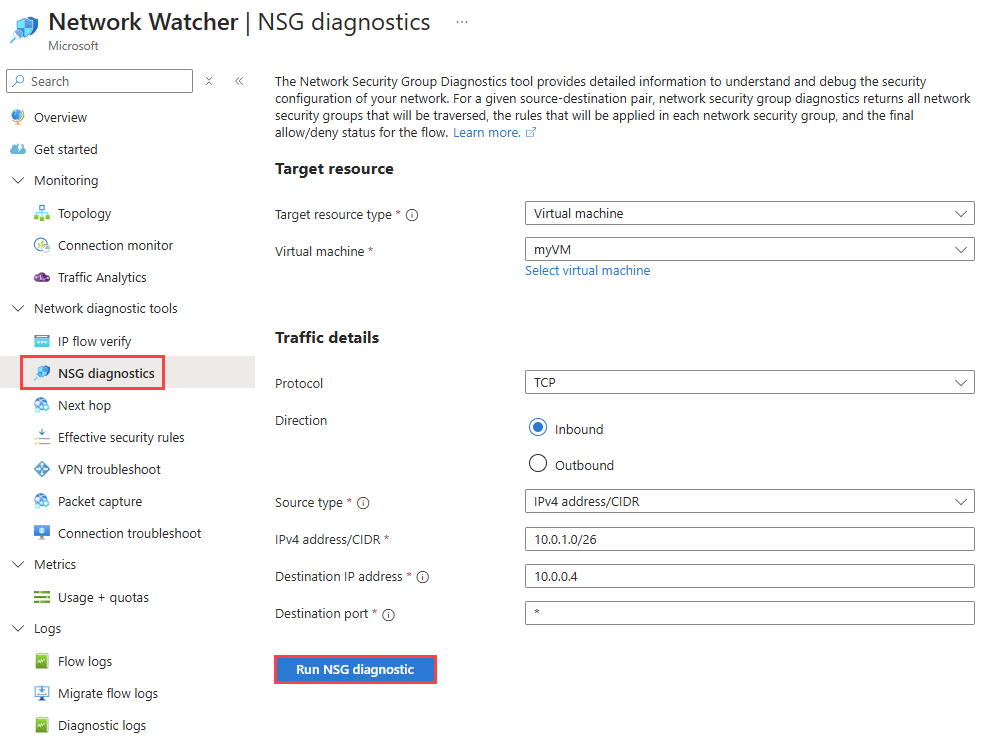 In this article, you learn how to use Azure Network Watcher NSG diagnostics to check and troubleshoot security rules applied to your Azure traffic through network security groups and Azure Virtual Network Manager. NSG diagnostics checks if the traffic is allowed or denied by applied security rules.