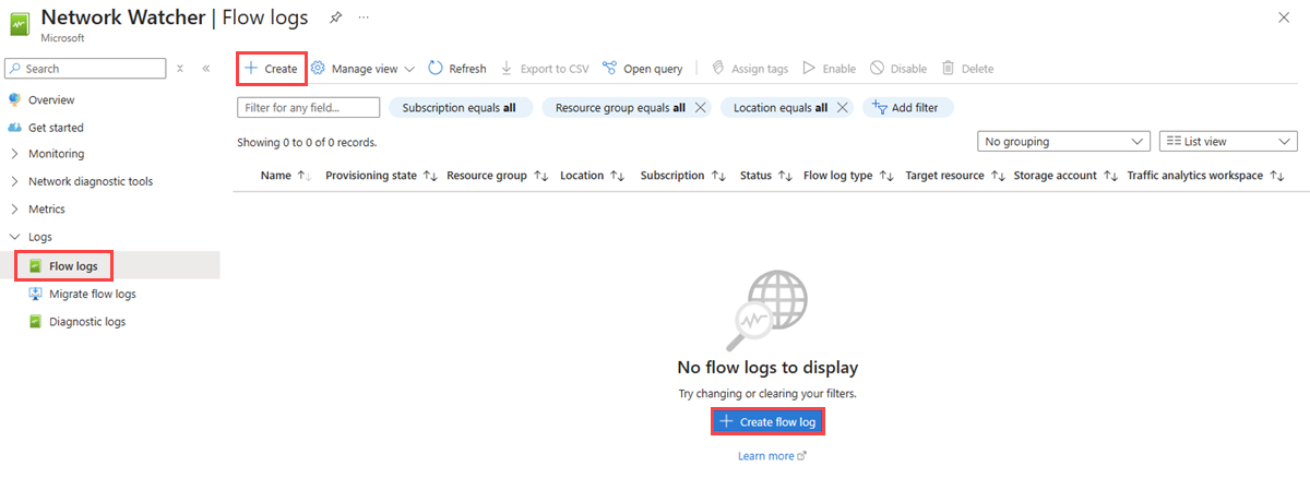 You can list all flow logs in a subscription or a group of subscriptions (Azure portal). You can also list all flow logs in a region.