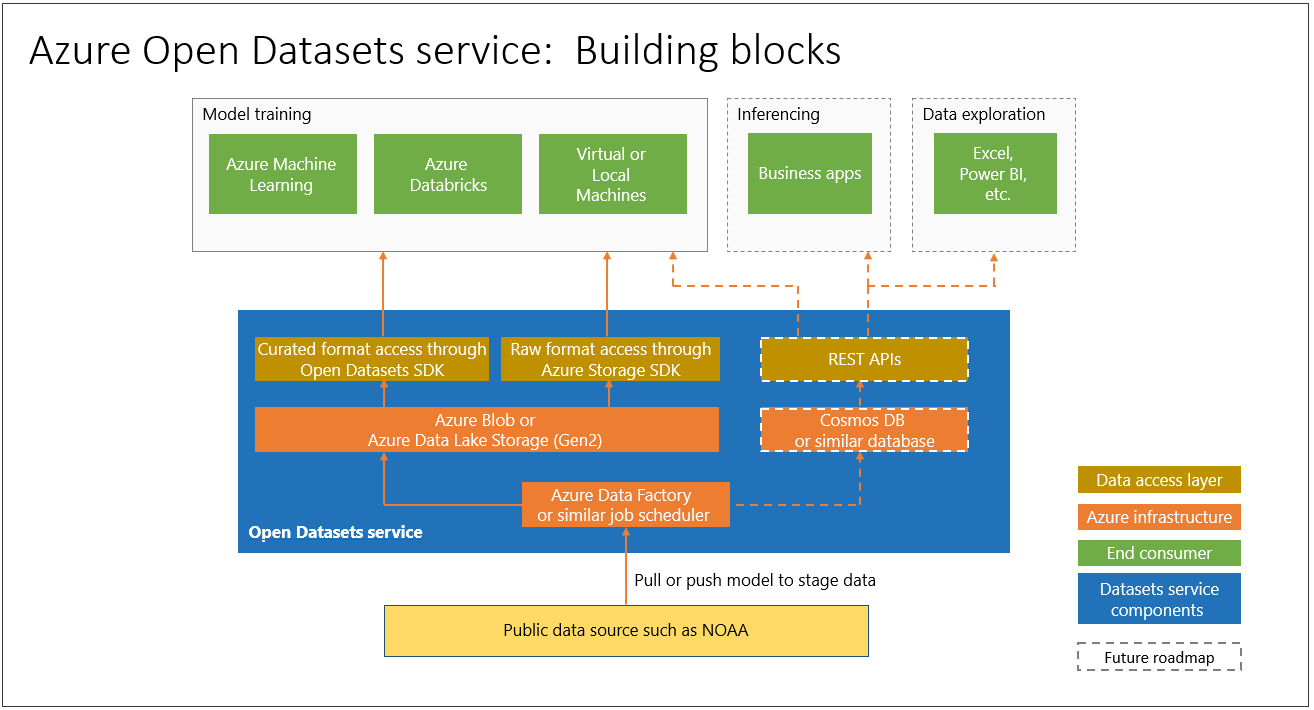Open Datasets are available through the Azure Machine Learning UI and SDK. Open Datasets also provide Azure Notebooks and Azure Databricks notebooks that can connect data to Azure Machine Learning and Azure Databricks. Datasets can also be accessed through a Python SDK.
