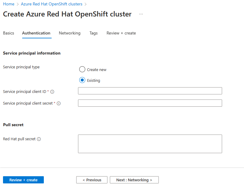 Under Service principal information, select either Create new or Existing. If you choose to use an existing service principal, enter the following information: