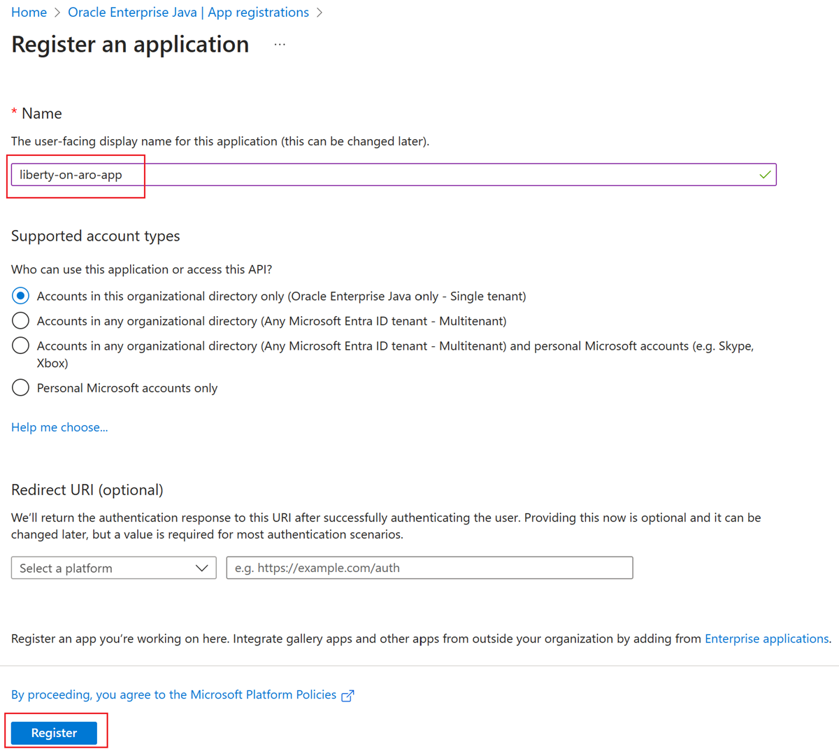Name the application, for example "liberty-on-aro-app". Select a supported account type, which determines who can use the application. After setting the values, select Register, as shown in the following screenshot. It takes several seconds to provision the application. Wait for the deployment to complete before proceeding.