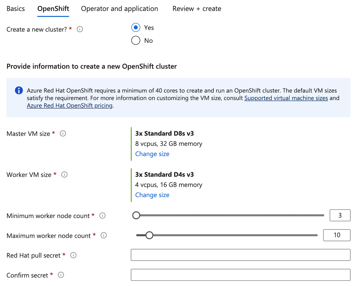 Under Provide information to create a new OpenShift cluster, for Master VM size, Worker VM size, Minimum worker node count, and Maximum worker node count, leave the values at their defaults. For more information on how to use these advanced options, see OpenShift Virtualization - Tuning & Scaling Guide.