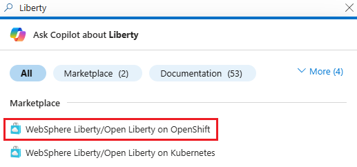 In the search bar at the top of the Azure portal, enter Liberty. In the autosuggested search results, in the Marketplace section, select WebSphere Liberty/Open Liberty on OpenShift, as shown in the following screenshot.