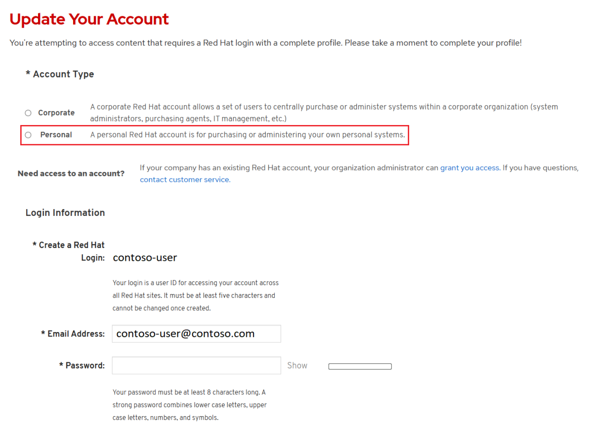 Use your Red Hat account to sign in to the OpenShift cluster manager portal, by visiting the Red Hat OpenShift Hybrid Cloud Console. You might need to accept more terms and update your account as shown in the following screenshot. Use the same password as when you created the account.