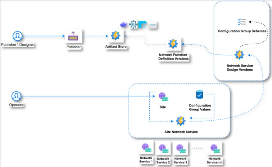 - The publisher role first onboards the network function (NF) to create a network function description (NFD).