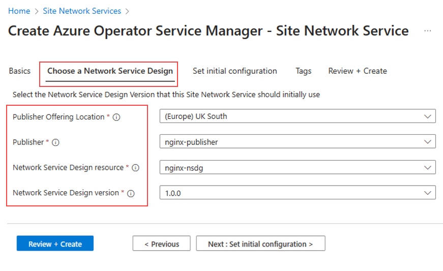 On the Choose a Network Service Design tab, select the Publisher, Network Service Design Resource, Network Service Design Version that you published earlier.