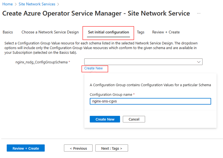 On the Set initial configuration tab, select a Configuration Group Value resource for each schema listed in the selected Network Service Design.
