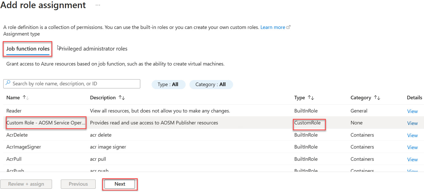You must create a custom role via Create a custom role. This article assumes that you named the custom role 'Custom Role - AOSM Service Operator access to Publisher.'