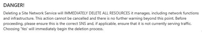 Deleting a Site Network Service (SNS) can be time consuming. It is important to inform the user in advance that deletions may take between 5 minutes to over an hour.