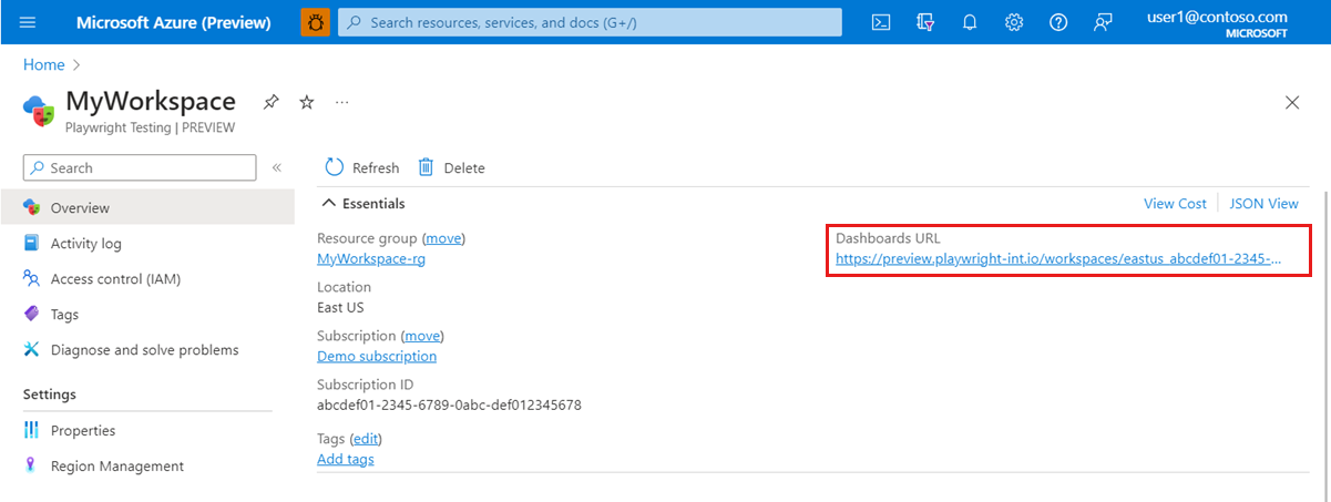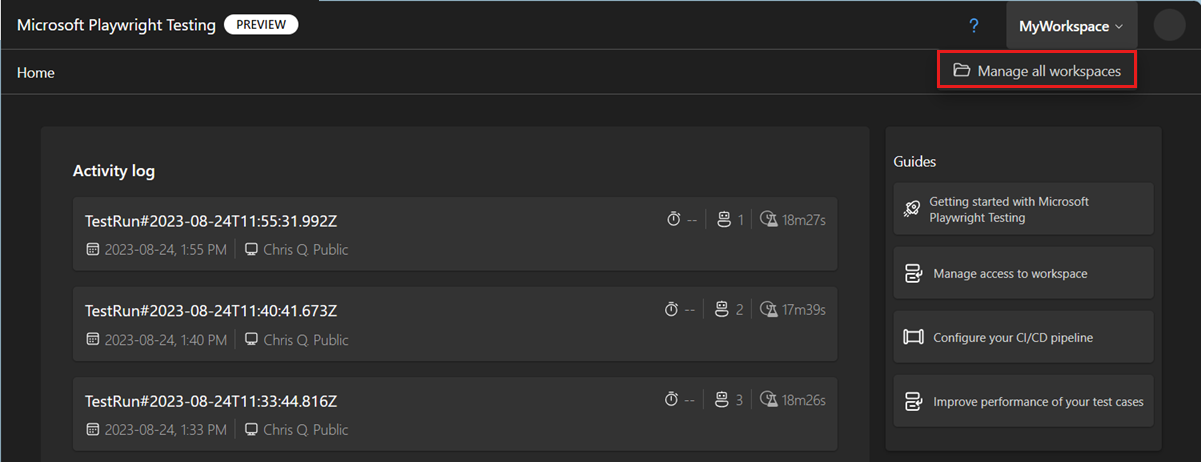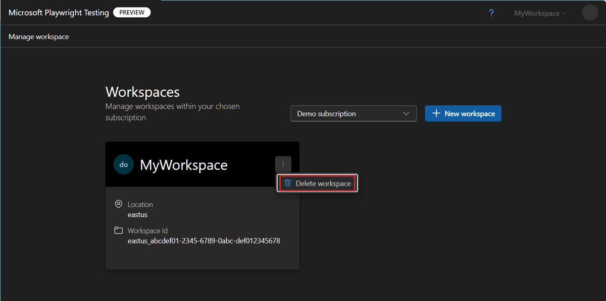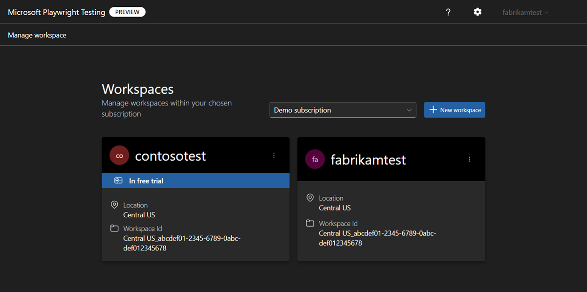 In this article, you create, view, and delete Microsoft Playwright Testing Preview workspaces. You can access and manage a workspace in the Azure portal or in the Playwright portal.