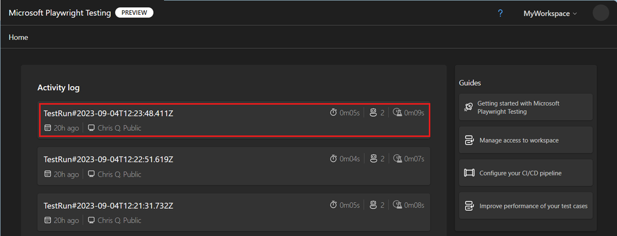 You can view the list of test runs for the workspace in the Playwright portal. Microsoft Playwright Testing only stores test run metadata, and doesn't store the test code, test results, trace files, or other artifacts.