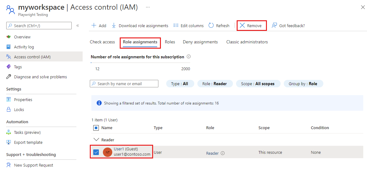 You can revoke a user's access to a Microsoft Playwright Testing workspace using the Azure portal: