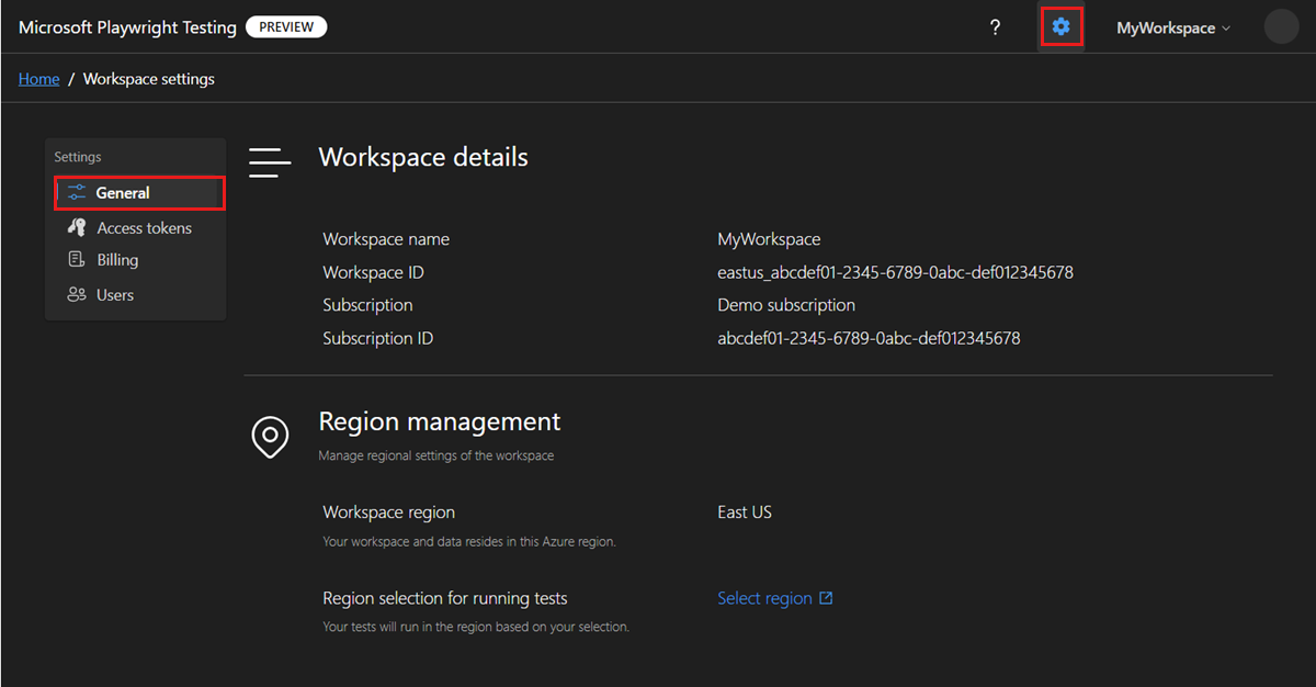 Select the workspace settings icon, and then go to the General page to view the workspace settings.
