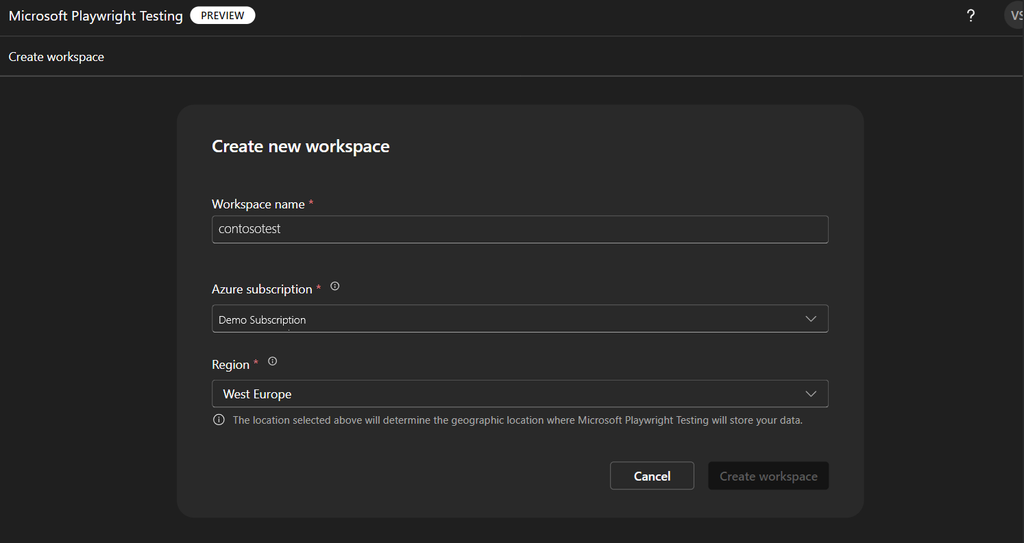 The name can only consist of alphanumerical characters, and have a length between 3 and 64 characters.Azure subscription Select the Azure subscription that you want to use for this Microsoft Playwright Testing workspace. Region Select a geographic location to host your workspace.